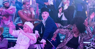 So the story is largely unchanged*, as are the more memorable songs - a few of the stage numbers have been dropped, a couple of new ones have been added to the soundtrack, while the most notable change is in Hugo's big number: The characters breaking out into song is largely presented as daydreams, but even so "The Legend of Loco Chanelle," with its story of Hugo's drag persona committing a crime of passion that dyes her white dress red, might have been an awkward tonal change. Instead we get something more literal and introspective, with Holly Johnson taking the lead (the rest of the cast all provide their own vocals) on "This Was Me," a flashback to the '80s and '90s that joins the recent trend of stories that won't allow people to forget why there aren't many gay men of Hugo's generation around.
