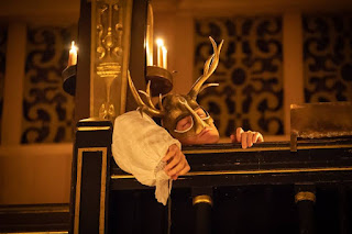 Paulette Randall’s is the first production of the play in the Swanamaker, and while things are kept murky the candlelit playhouse is never dropped completely into darkness as so often happens – possibly because the candles are used as a metaphor for the fires of Hell, and that’s something that’s always hanging over the story. Randall’s gender-switching of the lead roles is done matter-of-factly, the supernatural story outlandish enough for it not to make much difference who’s performing the magic. The only area where it does perhaps add a different perspective is in the revenge plot by Benvolio (Louis Maskell, who turns out to be much sexier when he has a face,) humiliated by Faustus in front of the court and furious at being outwitted by a woman.